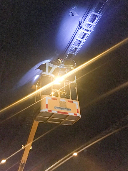 中午11:00,因流量過(guò)大,高速交警要求臨時(shí)開(kāi)放被堵主車(chē)道。趁此空隙機(jī)會(huì),中心隊(duì)伍暫撤到黃土嶺隧道管理所解決午餐,之后又馬不停蹄奔赴并集結(jié)在北洞口緊急停車(chē)帶,待重新封道后繼續(xù)跟進(jìn)作業(yè),力爭(zhēng)在審批時(shí)間內(nèi)做更多的維修。考慮到主車(chē)道燈具損壞不多,抽調(diào)一組登高車(chē)人員負(fù)責(zé)攝像頭檢修工作,而底下人員則負(fù)責(zé)修復(fù)更換消防、緊急電話等標(biāo)志燈,每組人員都在與時(shí)間賽跑,忙的顧不上喝水。