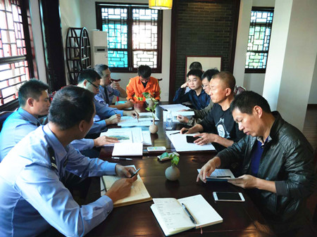 圖為各單位人員分析總結一天的施工情況