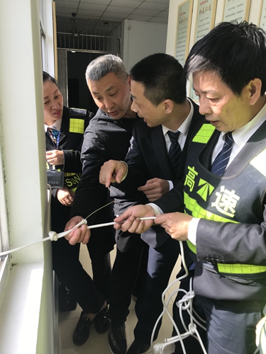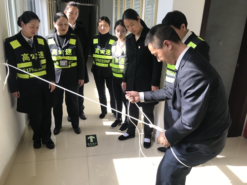 圖為演練現(xiàn)場 隨著所長孫明偉提問式的開場白,近日,臨海南收費所以班組為單位,分四天集中開展全員逃生繩演練活動。全所員工積極參與、親身體驗,活動達到預(yù)期效果。 整個演練過程中,培訓(xùn)人員詳細講解了打繩結(jié)的方法與注意要點,現(xiàn)場氣氛踴躍。通過開展此次活動,本所員工不僅掌握了逃生繩的使用方法,提高了高層逃生自救能力,而且進一步提高了面對突發(fā)火情的應(yīng)對能力,增強了“防火防災(zāi)”的安全意識。 陳瑩