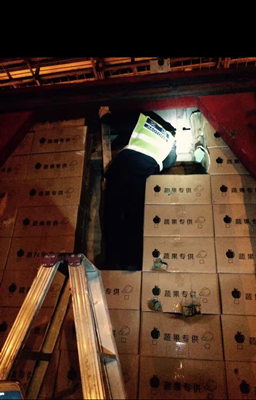 這輛從溫州南入口、車(chē)門(mén)上印著“蔬果特快”軸限40噸的115型大貨車(chē),在凌晨2:25分駛?cè)肱_(tái)州收費(fèi)所,司機(jī)自稱(chēng)運(yùn)送蘋(píng)果。當(dāng)檢查人員打開(kāi)車(chē)廂后門(mén),搬開(kāi)疊放著兩層的蘋(píng)果箱后,發(fā)現(xiàn)廂體另有天地,一個(gè)用鐵條焊成的架子沿著廂壁固定在廂體內(nèi)部,架子上豎著兩大片木板,木板遮擋了廂體六分之五的面積,透過(guò)木板縫隙能看到里面一箱箱的貨物。檢查人員把手伸進(jìn)包裝箱里,拆開(kāi)一看,里面全是電動(dòng)車(chē)的配件。