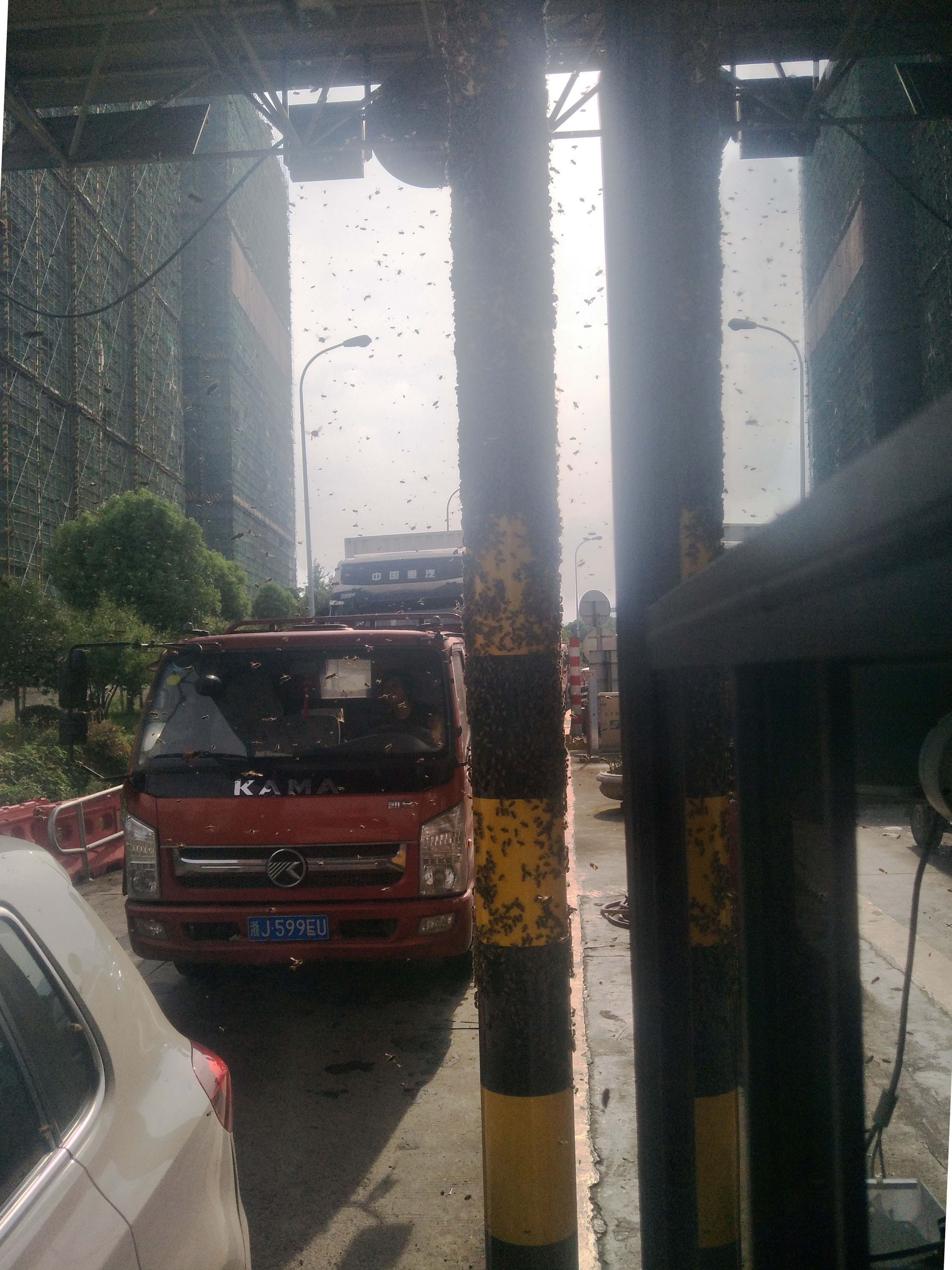 圖為蜜蜂集聚在收費站 原來這輛綠通車運輸蜂箱,由于蜂箱沒有關閉嚴實,在車通過車道檢查稍作停留時,大量的蜜蜂乘機逃出,圍攻收費崗亭,天空瞬間一片密密麻麻。它們有的停留在車道的防撞柱上,有的在收費窗口附近盤旋,遲遲不肯離開,嚇得過收費站等待繳費的司機不敢開車窗繳費。