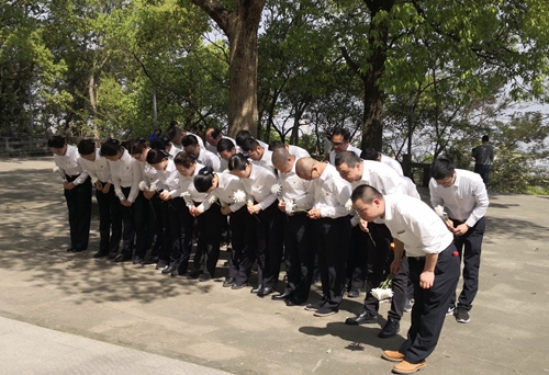圖為敬獻鮮花 九峰烈士陵園始建于1956年,埋葬著20世紀50年代為國捐軀的120余位革命先烈。墓區內青松翠柏環繞,墓前豎有一座“革命烈士永垂不朽”的石碑。上午10時許,祭掃儀式開始,全體人員懷著無比崇敬的心情向革命先烈鞠躬默哀,緊接著依次走到紀念碑前敬獻鮮花,表達對革命先驅的悼念與緬懷之情。在紀念碑前,全體黨員重溫入黨誓詞“我志愿加入中國共產黨,擁護黨的綱領,遵守黨的章程......”
