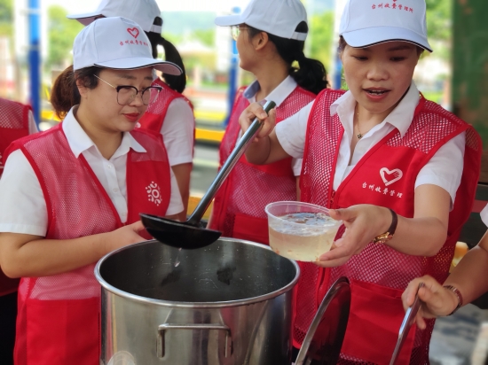 “師傅,請喝一杯青草糊吧。”司機接過去連聲感謝。 “真好喝,阿姨能再給我一杯嗎?我想帶著路上喝。”一位坐在后排的小姑娘對志愿者說。 “當然可以,這個帶蓋的給你帶著吧。” “謝謝阿姨。”