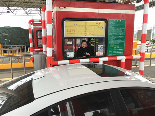 圖為工作人員在收費(fèi)站外廣場(chǎng)引導(dǎo)車輛有序通行