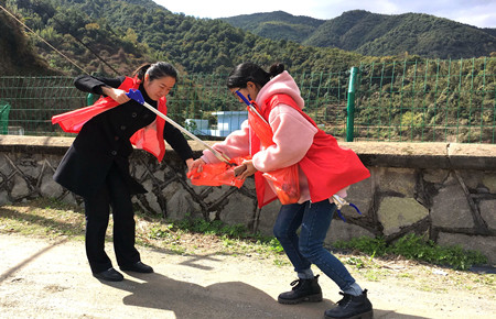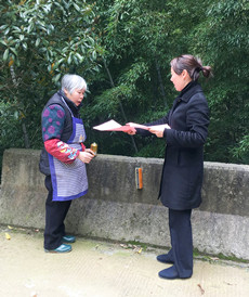圖為女職工向當(dāng)?shù)乩先诵麄髑迕魑拿骷罀?/span> 然而,女職工們卻不“安分守己”,以這樣的方式來慶祝自己的節(jié)日:她們兵分二路,一路擔(dān)起森林防火宣傳員,向過往群眾發(fā)放《清明文明祭掃和森林防火倡議書》,并對上了年紀(jì)的村民耐心講解倡議書內(nèi)容,將臺州高速的文明服務(wù)從工作中延伸到了生活中。一路環(huán)繞水庫去清理其邊上的垃圾,一上午下來,收獲還真不少,共清理廢紙、飲料罐、塑料袋等廢棄物若干袋,在打造“生態(tài)文明”中率先垂范,擔(dān)其責(zé),盡其力。