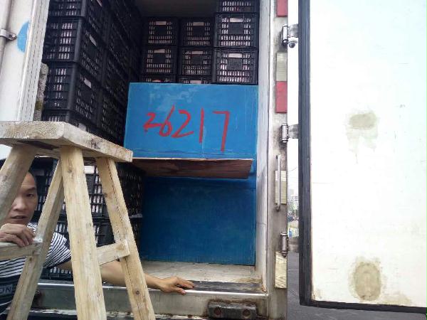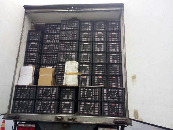 圖為被處罰的車輛 早上10點(diǎn)40分左右,這輛運(yùn)蘋果的貨車駛?cè)胧召M(fèi)站的一號(hào)崗?fù)ぃ緳C(jī)師傅說自己運(yùn)的是蘋果,根據(jù)公司規(guī)定,綠農(nóng)車檢查必須開車門檢查貨物。憑著多年的檢查經(jīng)驗(yàn),當(dāng)班班長童軍偉發(fā)現(xiàn)這輛綠農(nóng)車有問題,覺得重量遠(yuǎn)遠(yuǎn)不夠,可能不符合“綠農(nóng)”免費(fèi)政策。果不其然,車廂中“深藏玄機(jī)”,左右兩側(cè)各有一排玻璃鋼魚箱,這就給檢查增加了難度。當(dāng)班班長要求司機(jī)師傅把最后兩排箱子拿掉,想檢查玻璃魚缸,然而這個(gè)司機(jī)極其不配合,還惡意刁難工作人員,說什么也不搬蘋果。
