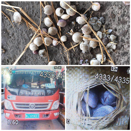 該車被篷布包著,車上貨物又被袋子緊緊包著。當工作人員要求檢查取證時,駕駛員只摳開指定的袋子,并且口子開得非常小,只讓人隱約看到貨物是貝殼。工作人員按規定要求駕駛員打開另一處取證,駕駛員以貨物被繩子綁著不好打開為由,只在前端把袋子摳了一個比硬幣大點的小洞,拿出幾個貝殼,工作人員看到其拿出的貝殼不管是在大小還是顏色上,都和他剛才指定的那袋貨物有明顯區別,于是工作人員親自用手摸進去查驗,經仔細檢查,貨物屬于貝殼中的殘次品,懷疑是飼料用途。