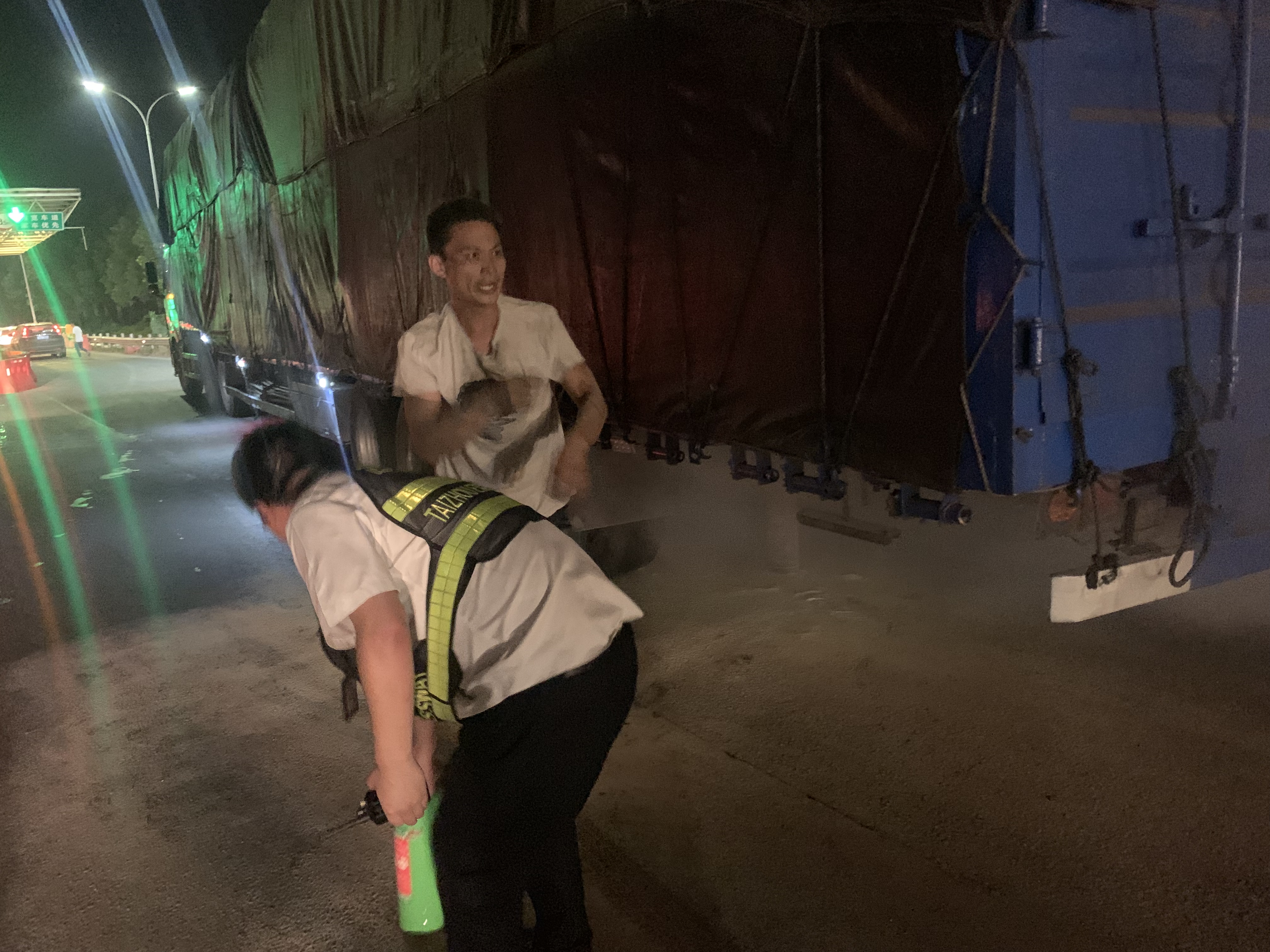 圖為收費員協助司機滅火 當時,正值收費員林王鍵負責高速入口的安全工作。他在巡查自助發卡機時發現入口處一輛貨車突然起火,隨之冒起了大片煙霧,并伴隨著刺鼻的氣味。林王鍵見狀立馬拎起身邊的滅火器就向貨車跑去,并且向班長報告。在工作人員和司機齊心協力撲救下,大火十幾分鐘就被撲滅了。經過檢查,起火的原因是因為貨車剎車突然抱死,摩擦起火。所幸大火并未造人人員傷亡和財產損失。 大火撲滅后,司機連連道謝,如果不是大家幫忙及時撲滅,后果不堪設想,他為工作人員這種奮不顧身的精神點贊。 在此,提醒各位司機,車輛上一定要配備滅火器等急救設備,特別在炎熱的夏天,是車輛起火的多發時期,配備滅火器可以有效控制火災,減少損失。 楊相暖