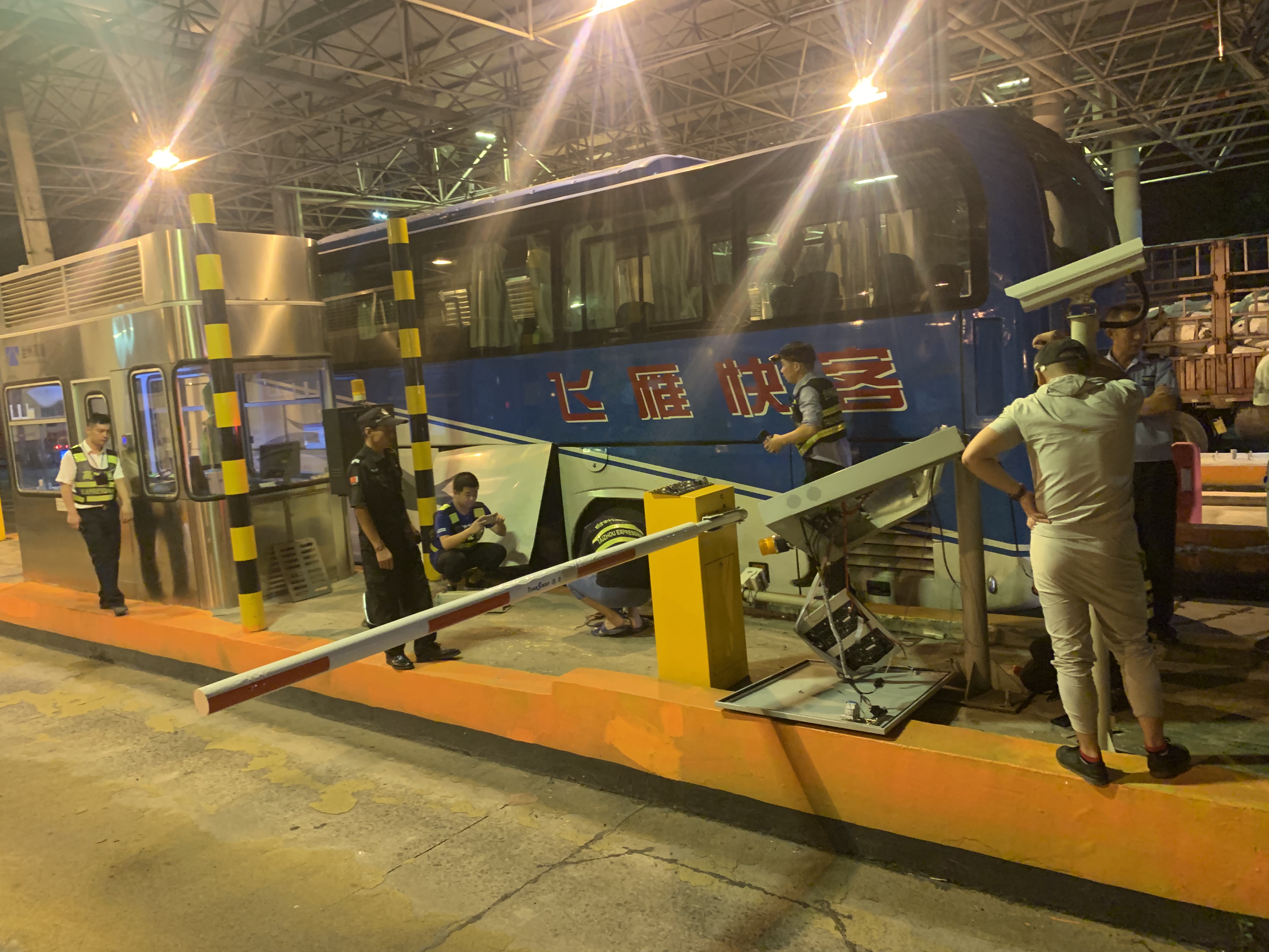 圖為事故處置現(xiàn)場 當(dāng)晚,收費員蔣弓在進(jìn)口車道突然聽到一聲巨響,發(fā)現(xiàn)一輛客車裝行李的側(cè)門撞到ETC設(shè)備,且損壞情況非常嚴(yán)重。因為大客車堵塞車道,后面的司機(jī)不明情況排起了車隊。班長李寧一邊協(xié)同派出所執(zhí)勤點工作人員維持秩序,一邊向監(jiān)控中心匯報現(xiàn)場情況。監(jiān)控中心也馬上聯(lián)系了路產(chǎn)、維養(yǎng)中心、高速交警多個部門。在20分鐘內(nèi)所有部門陸陸續(xù)續(xù)趕到現(xiàn)場。為盡快恢復(fù)交通,維養(yǎng)中心同事馬上對損壞ETC設(shè)備進(jìn)行拆卸檢測,路產(chǎn)部門對損壞設(shè)備進(jìn)行定損估價,高速交警勘查現(xiàn)場,拍照取證判定事故責(zé)任,溫嶺西收費所工作人員維持進(jìn)口秩序,大家都在高效有序地處理突發(fā)事件。