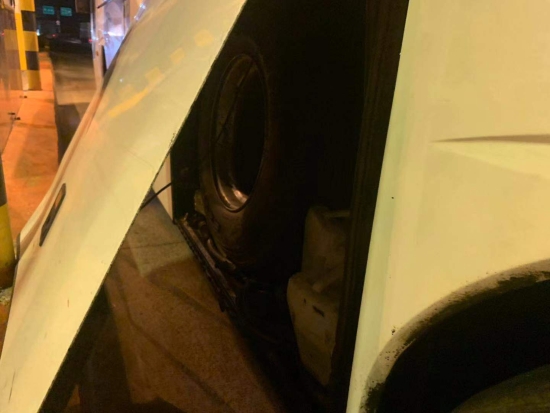 圖為被物品擠開的客車側(cè)門 此次事故由于客車車箱內(nèi)放置過多的物品,在車箱門邊上還硬塞了幾只大輪胎,最終導(dǎo)致輪胎將側(cè)門擠開而沒被司機(jī)發(fā)現(xiàn),在高速過ETC車道時箱門撞到了設(shè)備,司機(jī)對此也是后悔不已。 近期,收費站發(fā)生過不少同類事件,有司機(jī)通過ETC車道時因車速過快未感應(yīng)到線圈,擋風(fēng)玻璃撞到欄桿;有集裝箱后門沒關(guān)撞到ETC設(shè)備。在此提醒過往司乘行車前務(wù)必要檢查好車輛安全情況,過ETC車道需要慢行。如果在高速上出現(xiàn)突發(fā)情況也不要慌張,及時向工作人員或者撥打求助電話請求幫助。 楊相暖