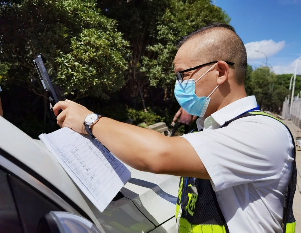 這是征費四班班長鄭星和駕駛員的對話,他手持iPad,不停地在屏幕上滑動著、查詢著。天氣炎熱,貨車開車時較為顛簸,3M膠軟化黏不牢ETC設備容易脫落。ETC設備一旦掉落,會提示“標簽已失效”,就無法正常工作,不能實現不停車出入高速公路ETC車道給來往司機和收費人員增添了很多麻煩。為全力配合ETC服務需要鄭星冒著酷暑高溫,不厭其煩幫著司乘人員解決問題,一天下來工作服濕了又干,干了又濕,他就是臺州高速上的最美堅守者。