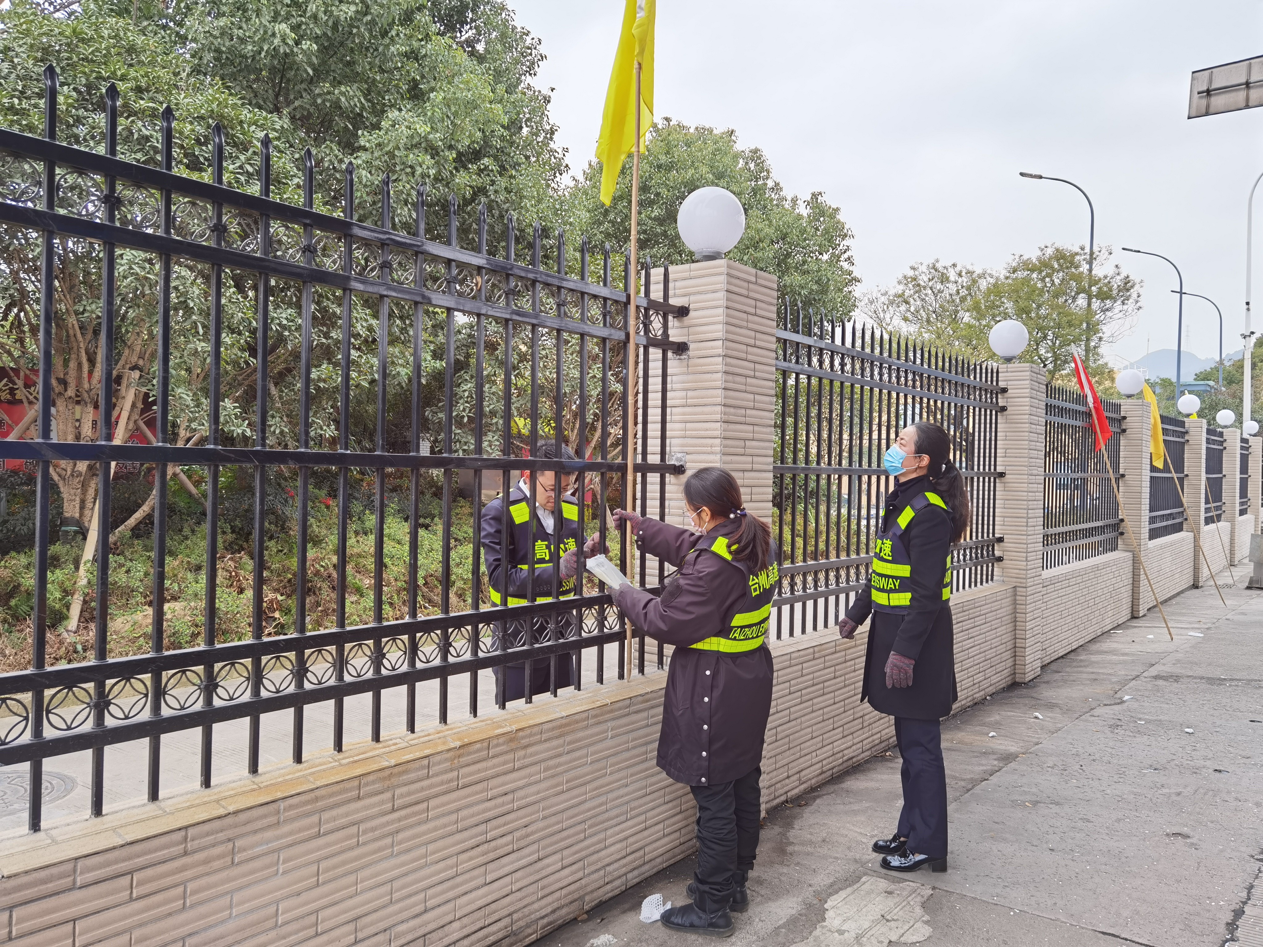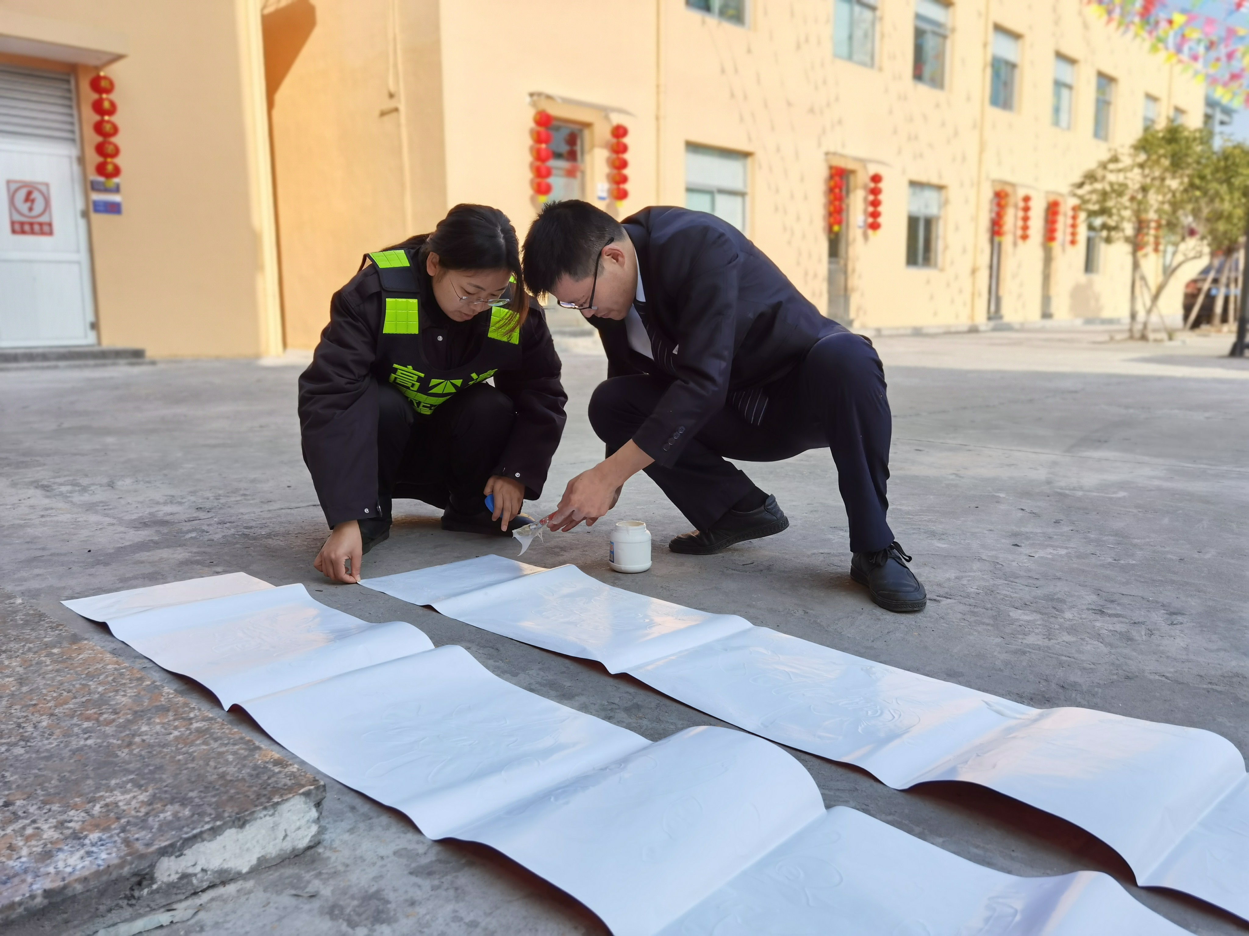 大家分工合作,搬梯子、遞春聯、貼膠帶、校正高低。在站所內每個角落都掛上了紅彤彤的燈籠;收費區域內廣場兩邊的欄桿上扎著一面面彩旗。一幅幅精致喜慶的對聯、“福”字,一串串三角彩旗,一個個大紅燈籠把整個收費站所點綴得處處洋溢著濃厚的節日氛圍,“年味”十足,讓在站員工和過往司乘朋友感受到新年的喜慶氛圍和“家”的溫暖。