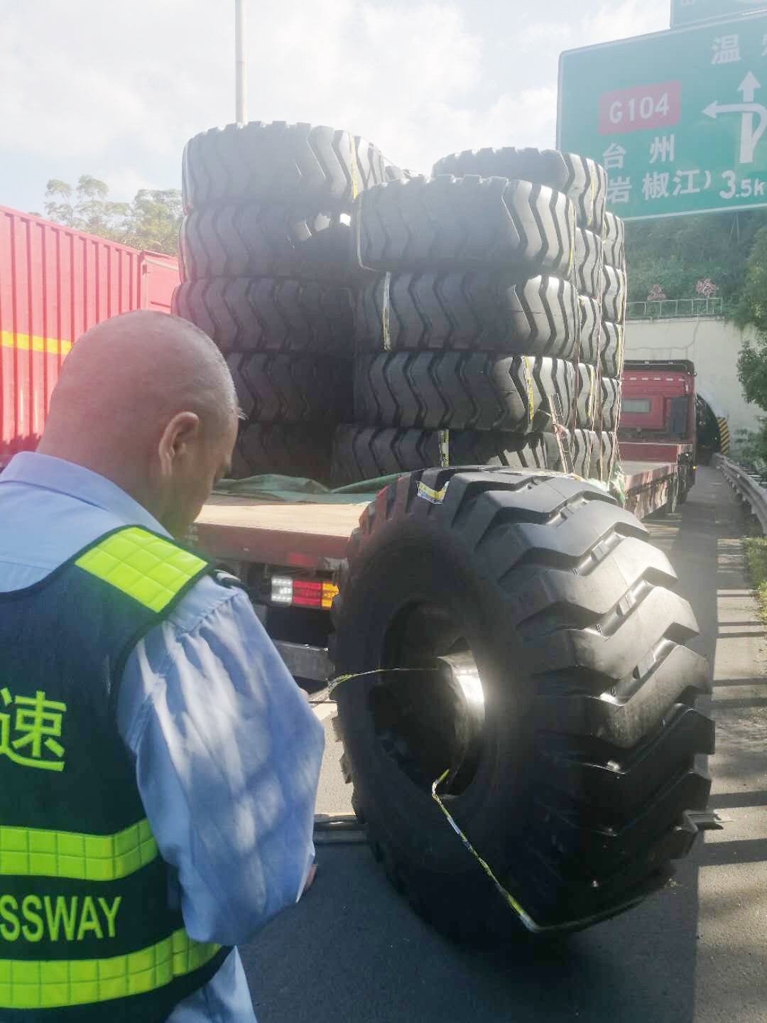 執(zhí)勤隊接警后立即趕往事故地點,一輛運載輪胎的貨車??吭谥鬈嚨?,其中一個巨型輪胎滑落到硬路肩上,致使后方車輛紛紛避讓。為及時消除險情,執(zhí)勤隊快速在現(xiàn)場做好安全警戒工作,同時將現(xiàn)場情況反饋給監(jiān)控中心。由于貨車綁繩索松動,重達(dá)300多斤的輪胎脫落在地,隨后執(zhí)勤隊協(xié)同施救中心、駕駛?cè)?/span>員合力將掉落的輪胎先拖至車旁,經(jīng)過長達(dá)半個小時的搶險,跌落的貨物終于完好無缺地回到貨車上,道路恢復(fù)暢通。 筆者溫馨提醒:在高速公路行駛過程中,駕駛?cè)藨?yīng)注意將車上的貨物固定好,途中要隨時注意貨物及捆綁繩索是否松動。無論是車輛撒落物還是人為拋灑物,都會給道路安全暢通埋下了重大隱患! 林玲