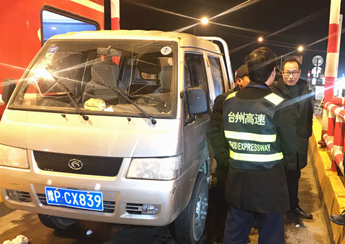 圖為公司副總經(jīng)理章海峰在臺州南收費(fèi)站向拒付通行費(fèi)人員解釋相關(guān)政策