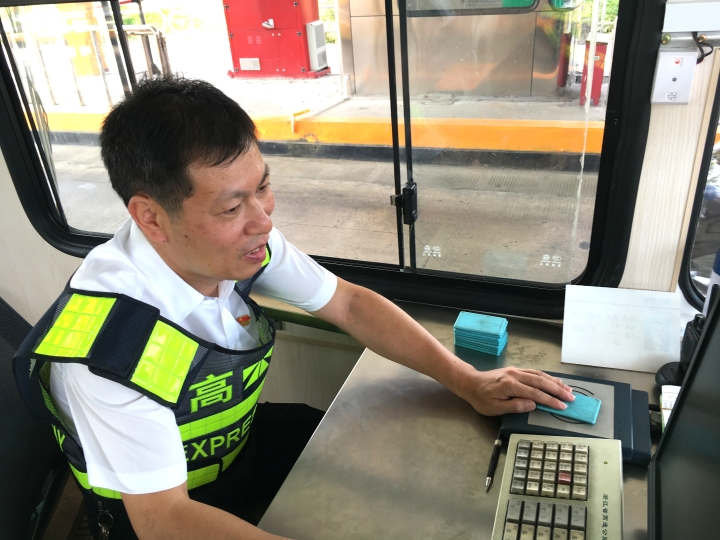 而在對面發(fā)卡的安全總監(jiān)項同富正襟危坐,等待著車子的駛入,“記住動作就忘記微笑,笑起來又忘記要說什么......真有點手忙腳亂的,做好收費員,不容易。”