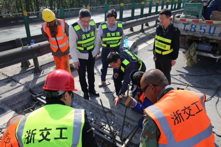 隨后,在伸縮縫型鋼安裝現(xiàn)場,陳文波撿起鑿除的碎渣,查看被鑿除的舊伸縮縫情況。公司所轄路段屬于軟土路基,且有91座橋梁,由于運(yùn)行時間已20余年,部分橋梁伸縮縫破損較為嚴(yán)重,如何維修橋梁伸縮縫和橋頭跳一直是個老大難問題。在橋梁伸縮縫修補(bǔ)現(xiàn)場,因為重車的碾壓,部分伸縮縫已經(jīng)磨損嚴(yán)重,所在的混凝土路面只能借助鑿巖機(jī)進(jìn)行作業(yè)。