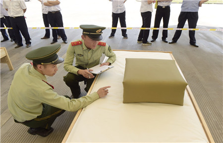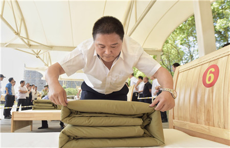 教官用手量量被子上下厚度,四周細細觀察,在兩床“豆腐塊”被子之間反復來回查看了幾遍,又與另一個教官指指點點商量了好久,不僅是參賽者,圍觀者都開始緊張了。確實,按照內務整理要求,這兩床已被疊成豆腐塊的被子折得有棱有角,被面光滑,上下勻稱,外行人看來就是一模一樣的完美,沒有任何區別了。“讓他們都晉級吧。”旁觀者說。教官笑著搖搖頭,對大家解釋道:“3號床勝出,因為它是雙面折法,在規定時間內兩面修整程度都一樣平整,這樣比起來,5號床稍遜一籌。”