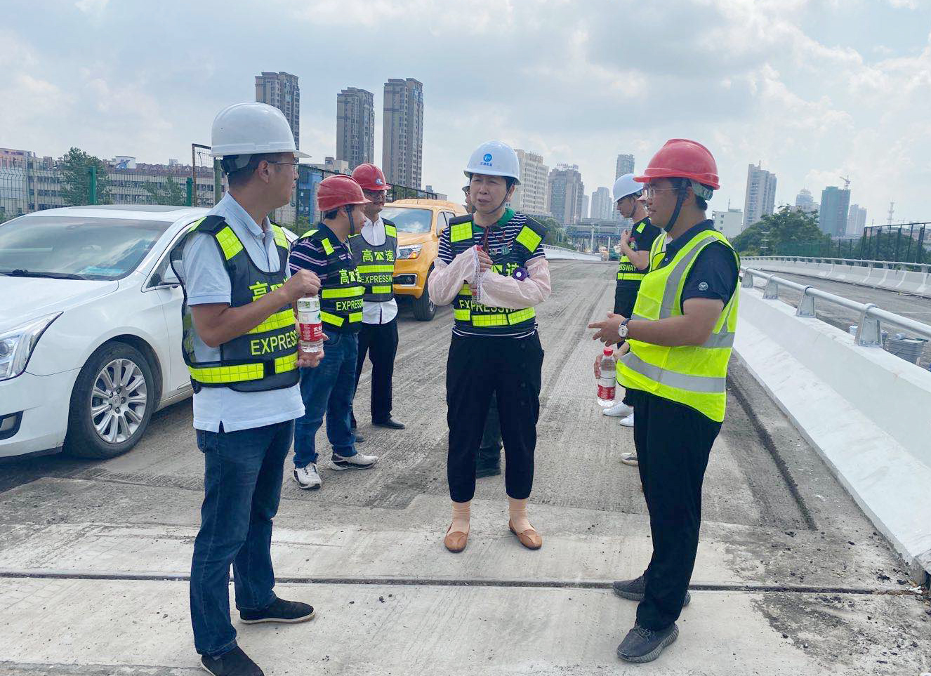 臺州市交通工程質量安全監督站一行督查公司路段施工 8月21日,臺州市交通工程質量安全監督站副站長柯善剛,副總工程師羅衛萍一行到公司所轄路段施工現場督察,查看施工質量、安全以及進展情況。工程養護部、施工單位、監理單位等人員陪同。