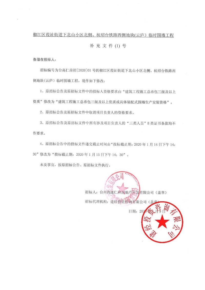 椒江區葭沚街道下北山小區北側、杭紹臺鐵路西側地塊(云廬)臨時圍墻工程補充文件