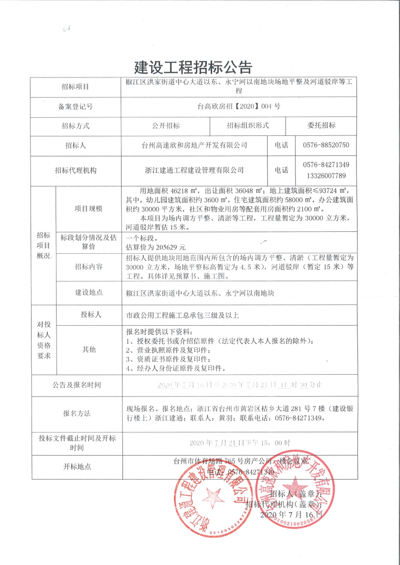 椒江區(qū)洪家街道中心大道以東、永寧河以南地塊場(chǎng)地平整及河道駁岸等工程招標(biāo)公告