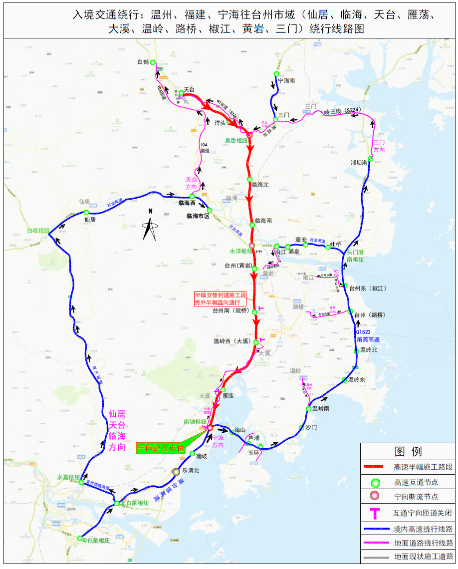 屆時雁蕩、溫嶺西(大溪)、臺州南(院橋)、臺州(黃巖)寧波方向關閉14天,臨海南、臨海北互通寧波方向進口關閉7天,洋頭互通上虞方向進口關閉7天,所有車輛禁止上高速;溫州方向進出口將根據改道需要臨時關閉。