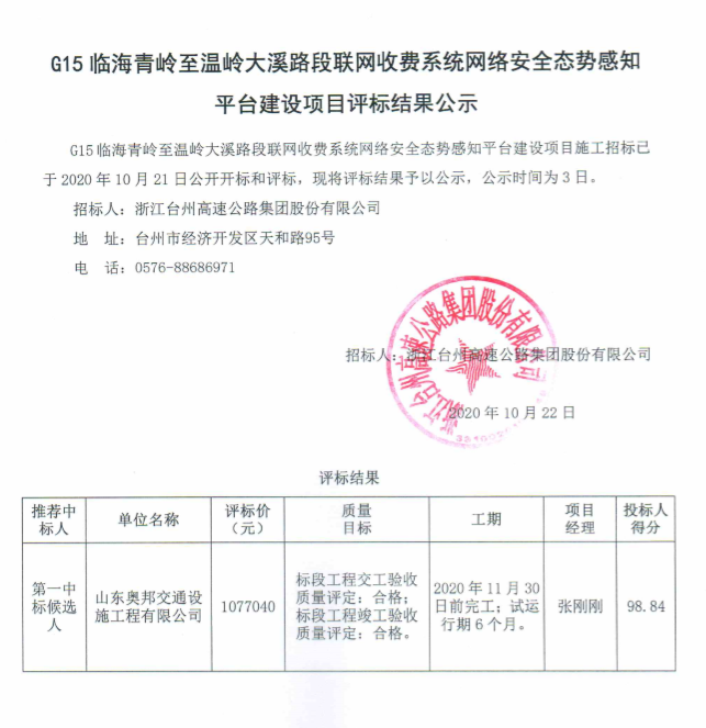 G15臨海青嶺至溫嶺大溪路段聯(lián)網(wǎng)收費系統(tǒng)網(wǎng)絡安全態(tài)勢感知平臺建設項目評標結果公示