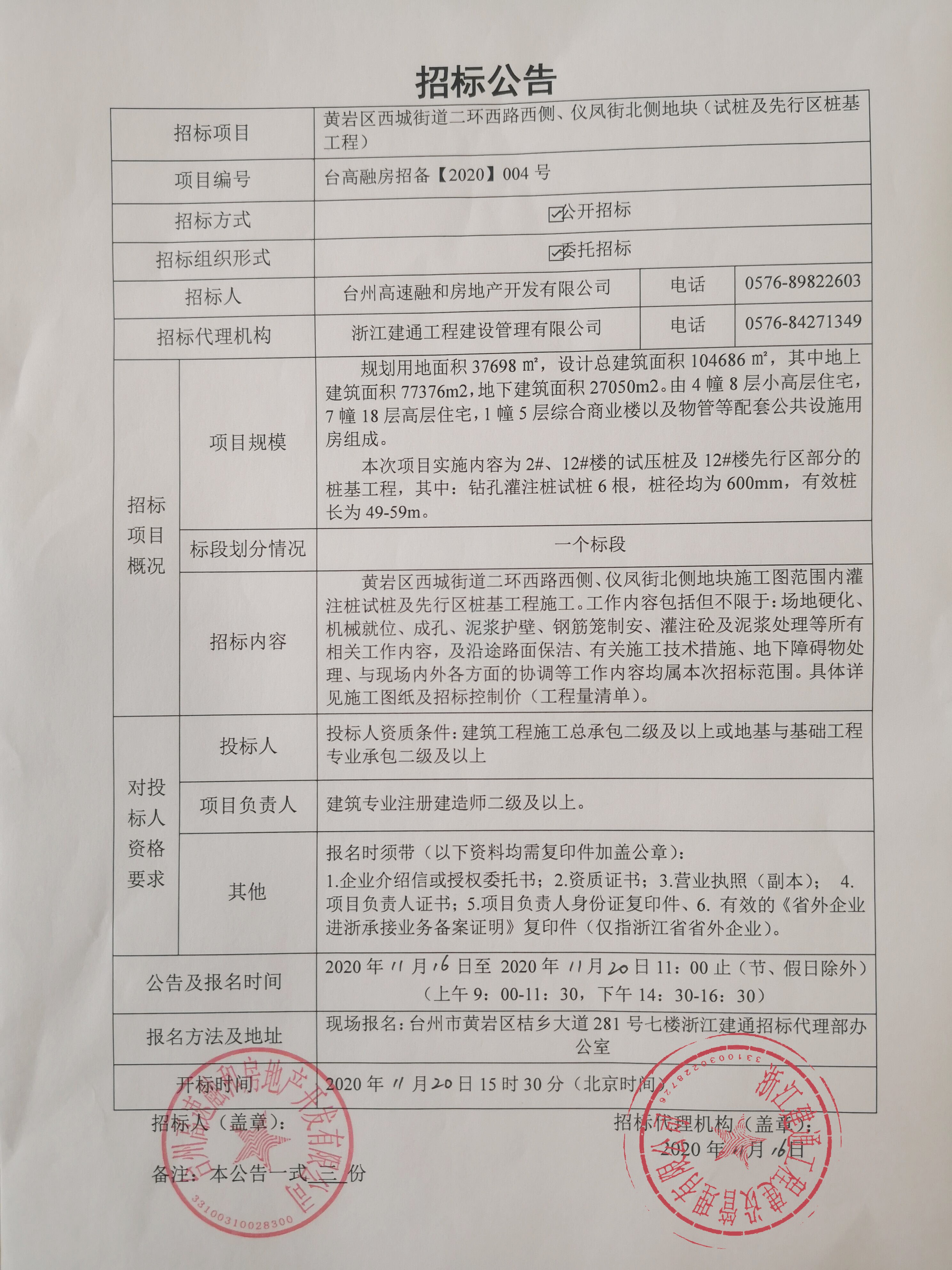 黃巖區西城街道二環西路西側、儀鳳街北側地塊(試樁及先行區樁基工程)招標公告