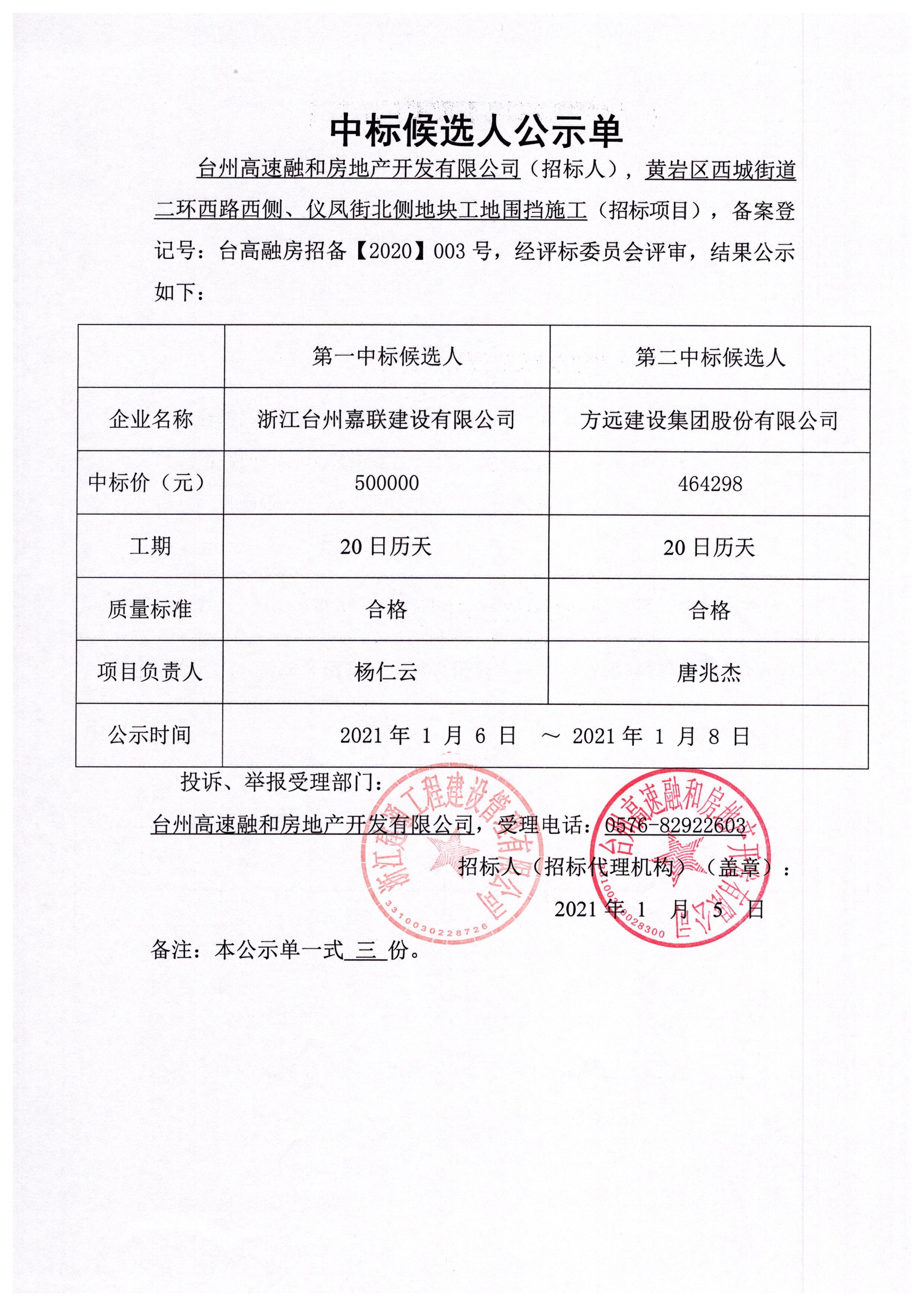 黃巖區西城街道二環西路西側、儀鳳街北側地塊工地圍擋施工中標候選人公示單