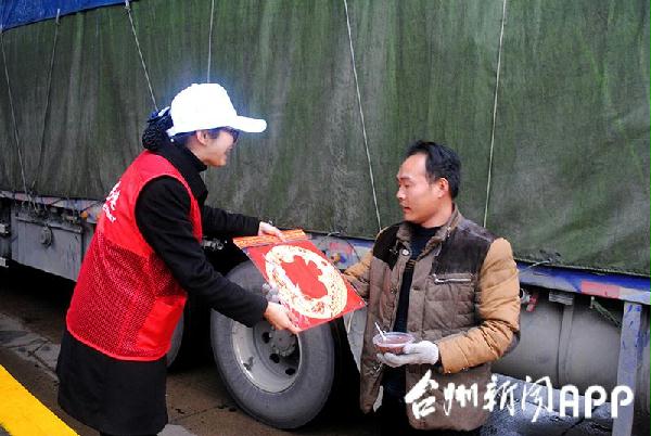 圖為志愿者為司機送上“?!弊?。鄭瑛芝攝